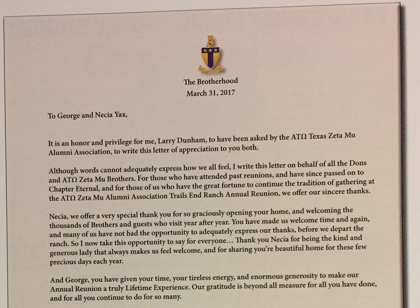 Although words cannot adequately express how we all feel, this letter is written on behalf of all Dons and ATO Zeta Mu Brothers. For those who have attended past reunions, and have since passed on to Chapter Eternal, and for those of us who have the great fortune to continue the tradition of gathering at the ATO Zeta Mu Alumni Association Trails End Ranch Annual Reunion, we offer our sincere thanks.